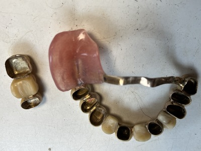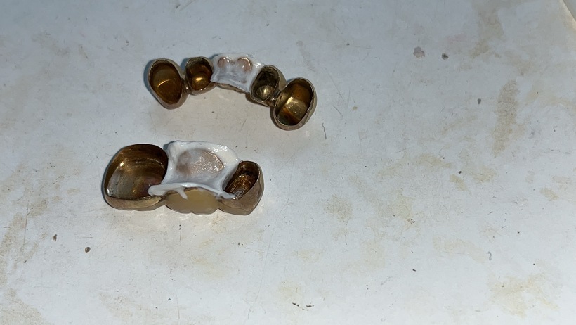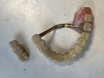 コーヌス冠は1歯では使用しません。複数歯で連結して使用し、特に欠損歯を作成するときに利用されます。簡単なものですとBr(ブリッジ)です。